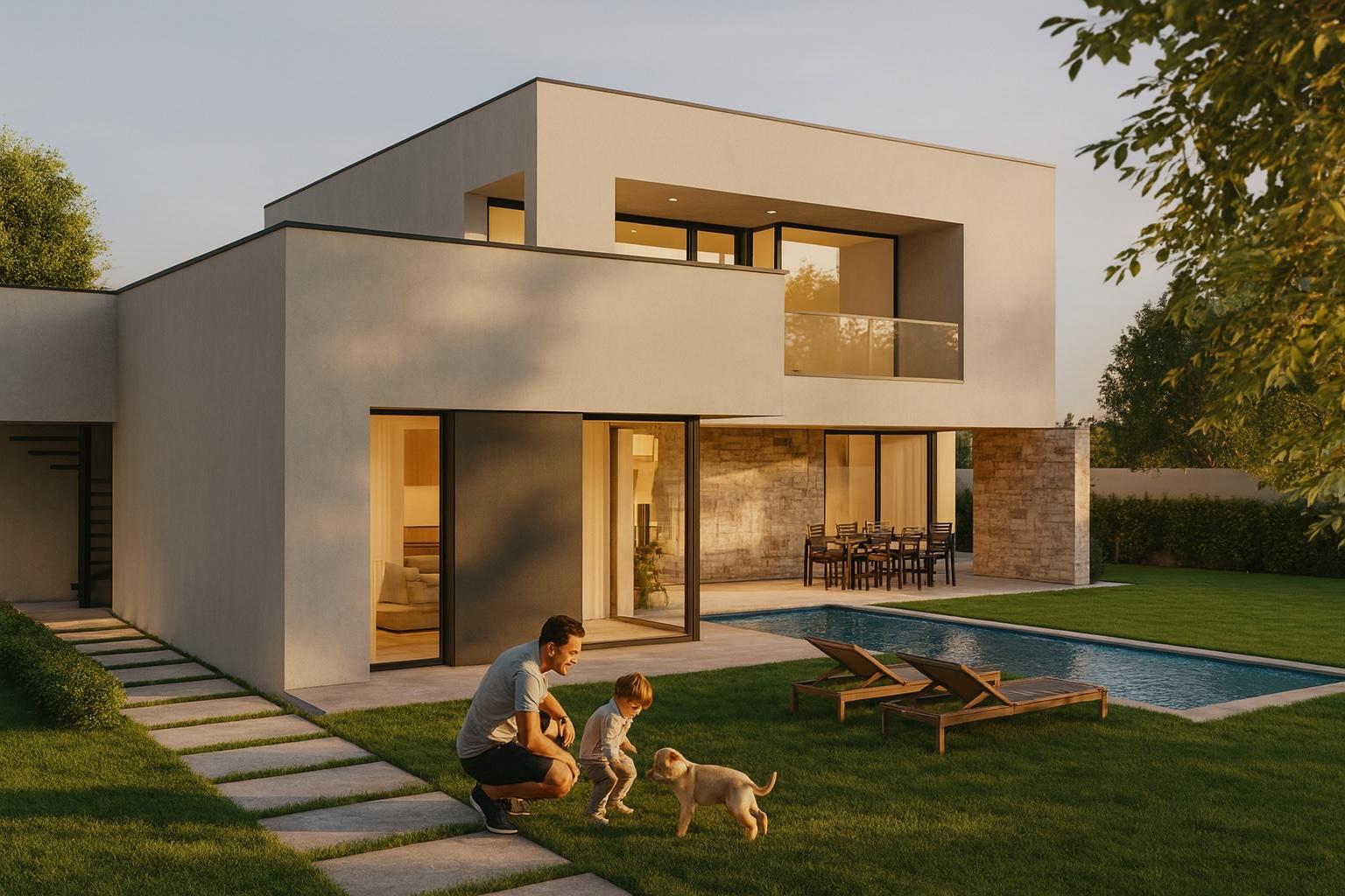 A completely flat plot of 1,009 m² will host 307 m² of pure lines, natural stone, large windows and a low-maintenance garden with a private pool.
